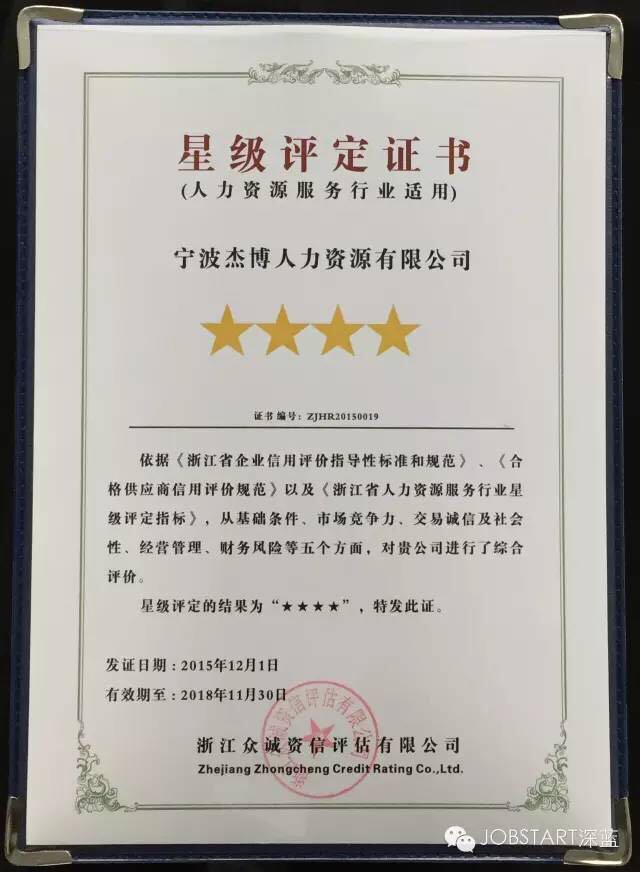 記者關(guān)注到,來自寧波的人力資源企業(yè)——寧波杰博人力資源有限公司在本次評比中脫穎而出,成為浙江省首批四星級人力資源服務(wù)企業(yè)。
