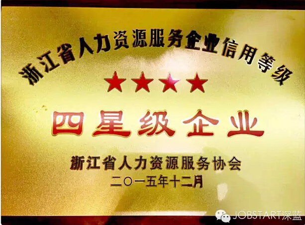 2016年1月6日,在杭州召開的浙江省人力資源服務(wù)協(xié)會第一屆第三次會員大會典禮上,包括寧波杰博人力資源有限公司在內(nèi)的17家人力資源企業(yè)獲評首批“浙江省人力資源服務(wù)星級企業(yè)”殊榮,其中,杰博人力資源獲評“四星級”企業(yè)。