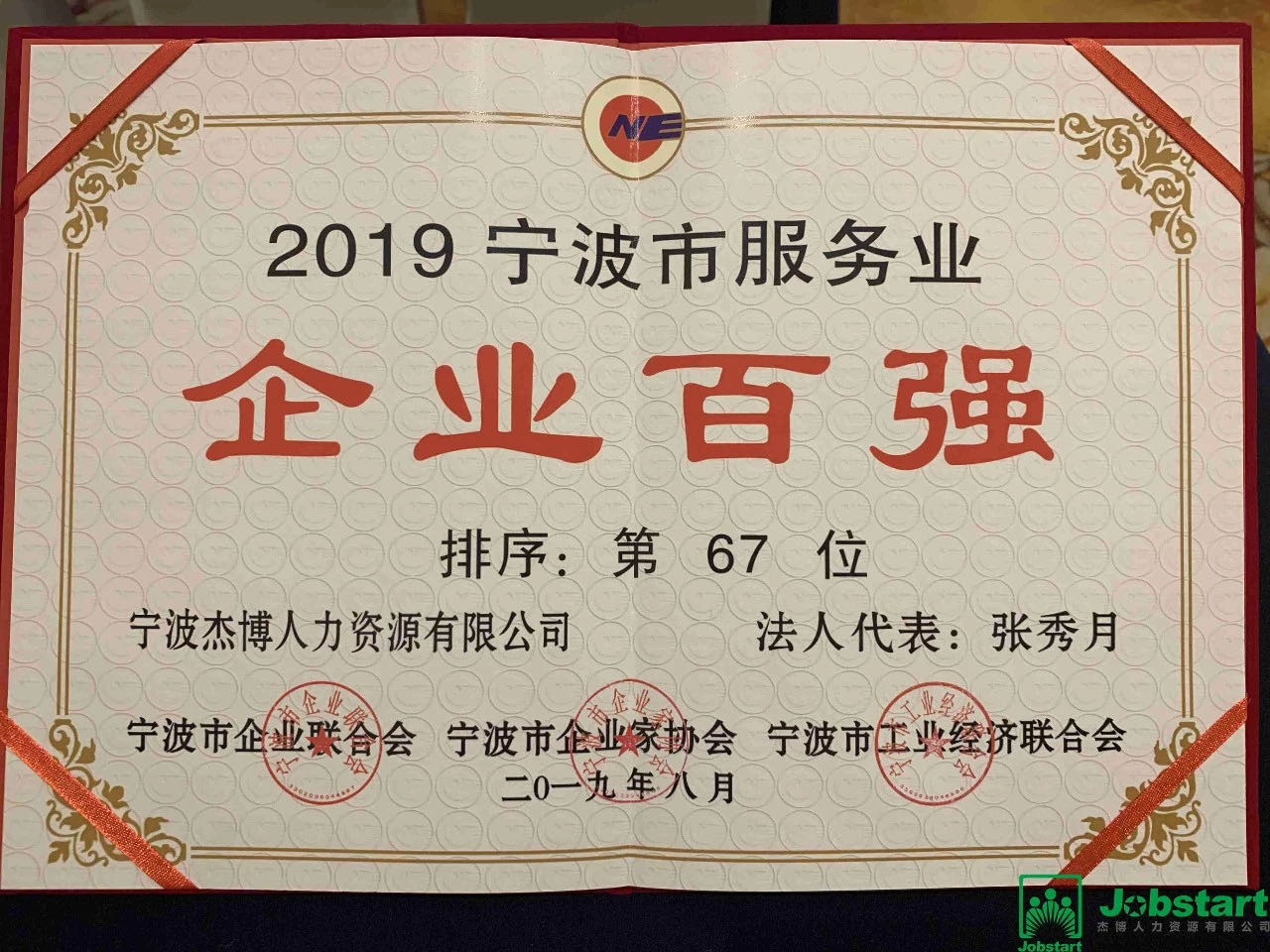 公司業(yè)務(wù)團(tuán)隊(duì)合伙人陳國才代表我司出席了頒獎(jiǎng)典禮。在本次頒獎(jiǎng)典禮中,寧波杰博人力資源有限公司喜獲“2019寧波市服務(wù)業(yè)百強(qiáng)企業(yè)”第67位!
